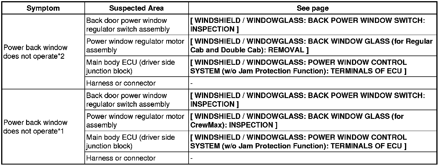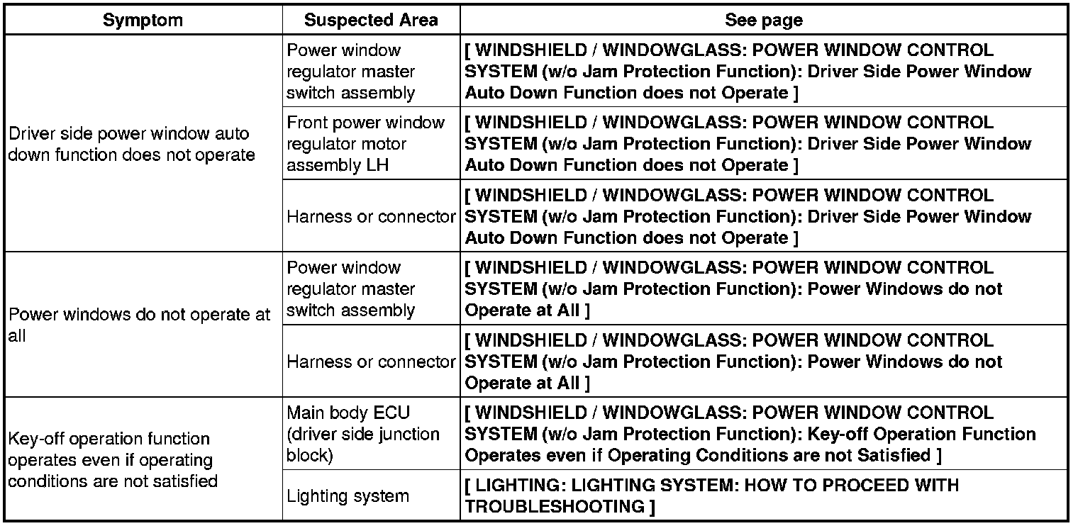 WINDSHIELD / WINDOW GLASS: POWER WINDOW CONTROL SYSTEM (w/o Jam Protection Function): PROBLEM SYMPTOMS TABLE