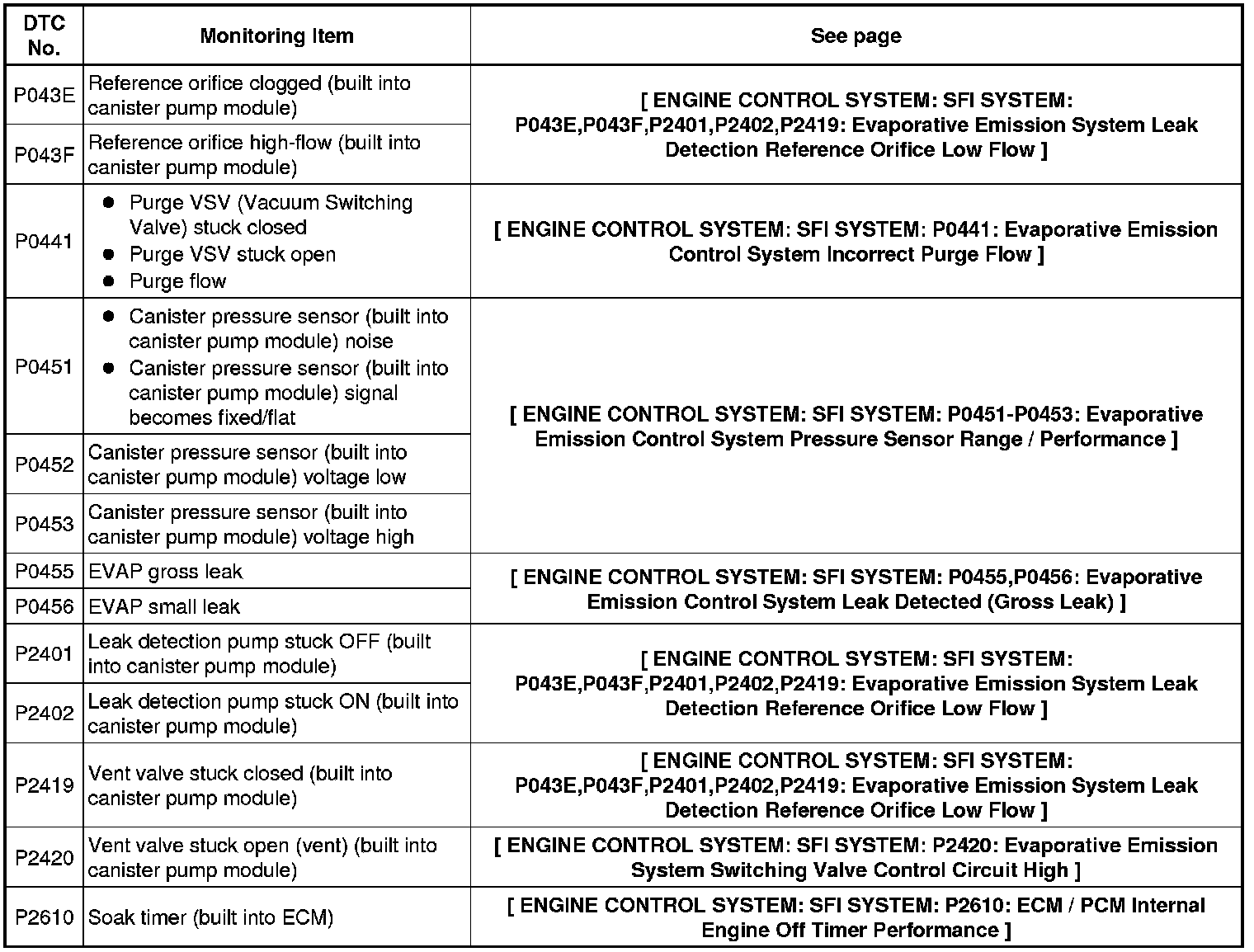 The leak detection pump creates negative pressure (vacuum) in the EVAP system and the pressure is measured. Finally, the ECM monitors for leaks from the EVAP system, and malfunctions in both the canister pump module and purge VSV based on the EVAP pressure.