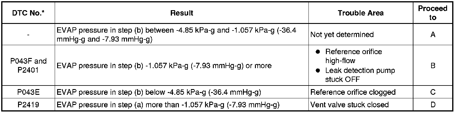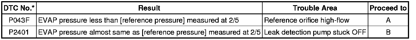If the reference pressure difference between the first and second checks is greater than the specification, all the DTCs relating to the reference pressure (P043E, P043F, P2401, P2402 and P2419) are stored.