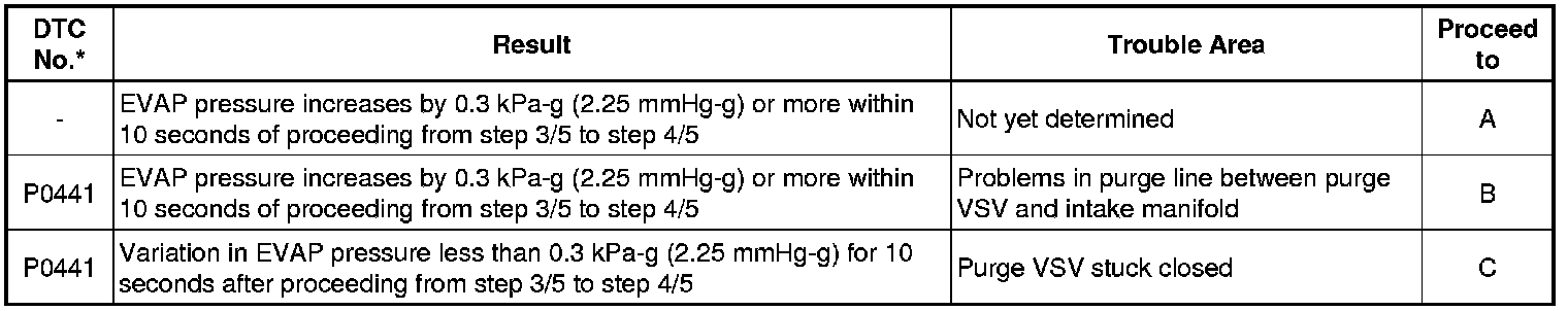 The vent valve is turned ON (closed) and the EVAP pressure is measured. If the variation in the pressure is less than 0.4 kPa-g (3.0 mmHg-g), the ECM interprets this as the purge VSV being stuck closed, and illuminates the MIL and stores DTC P0441 (2 trip detection logic).