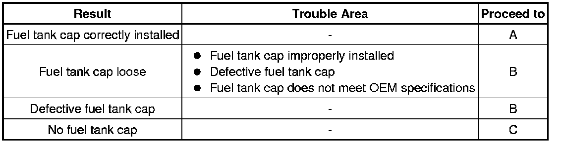If any EVAP system DTCs are stored, the malfunctioning area can be determined using the table below.