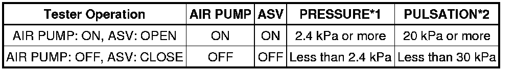 (h) Check that the air pump (AIR PUMP), ASV and pressure in the AIR system passage (PRESSURE) status displayed on the Techstream indicate the conditions shown in the table below.