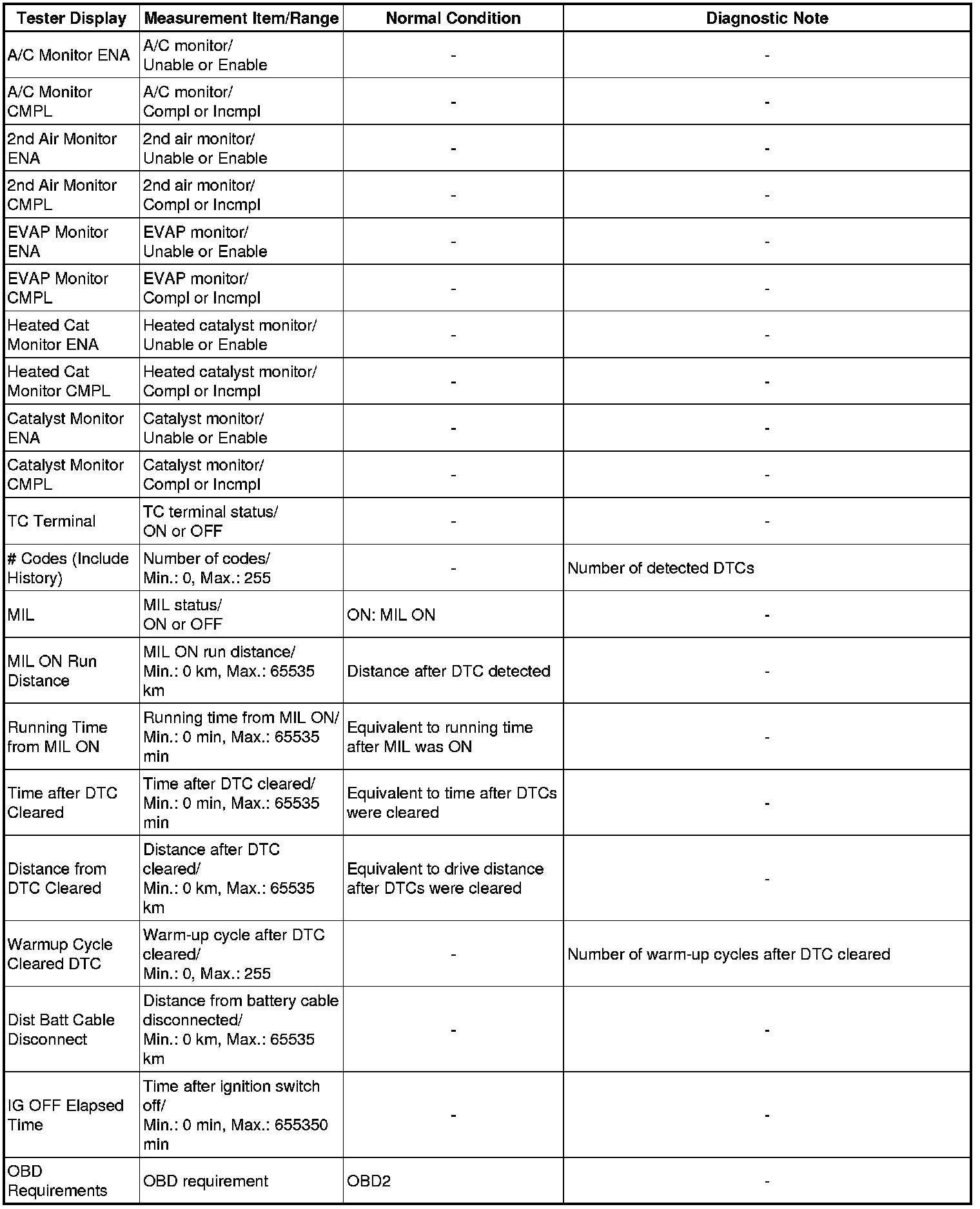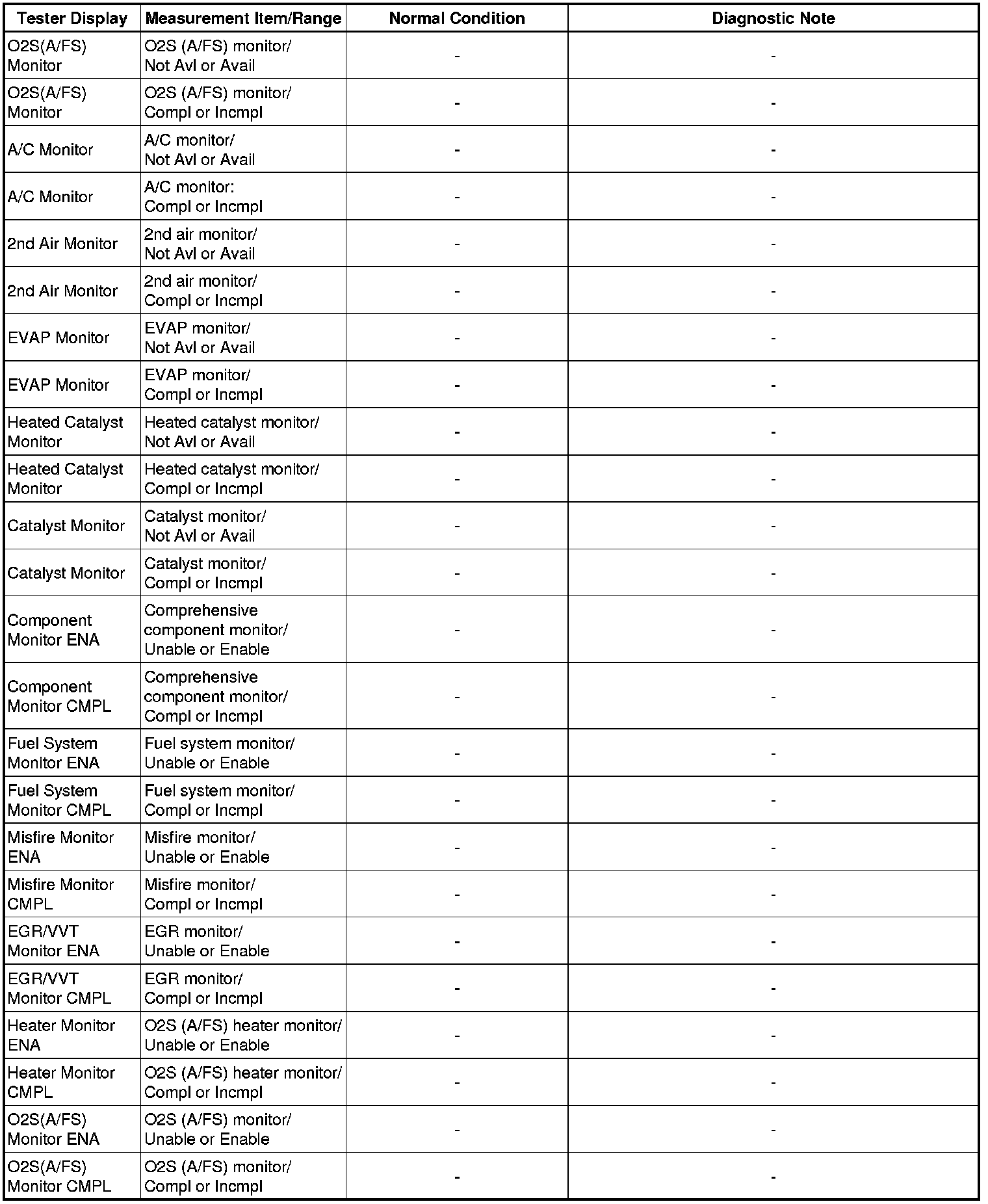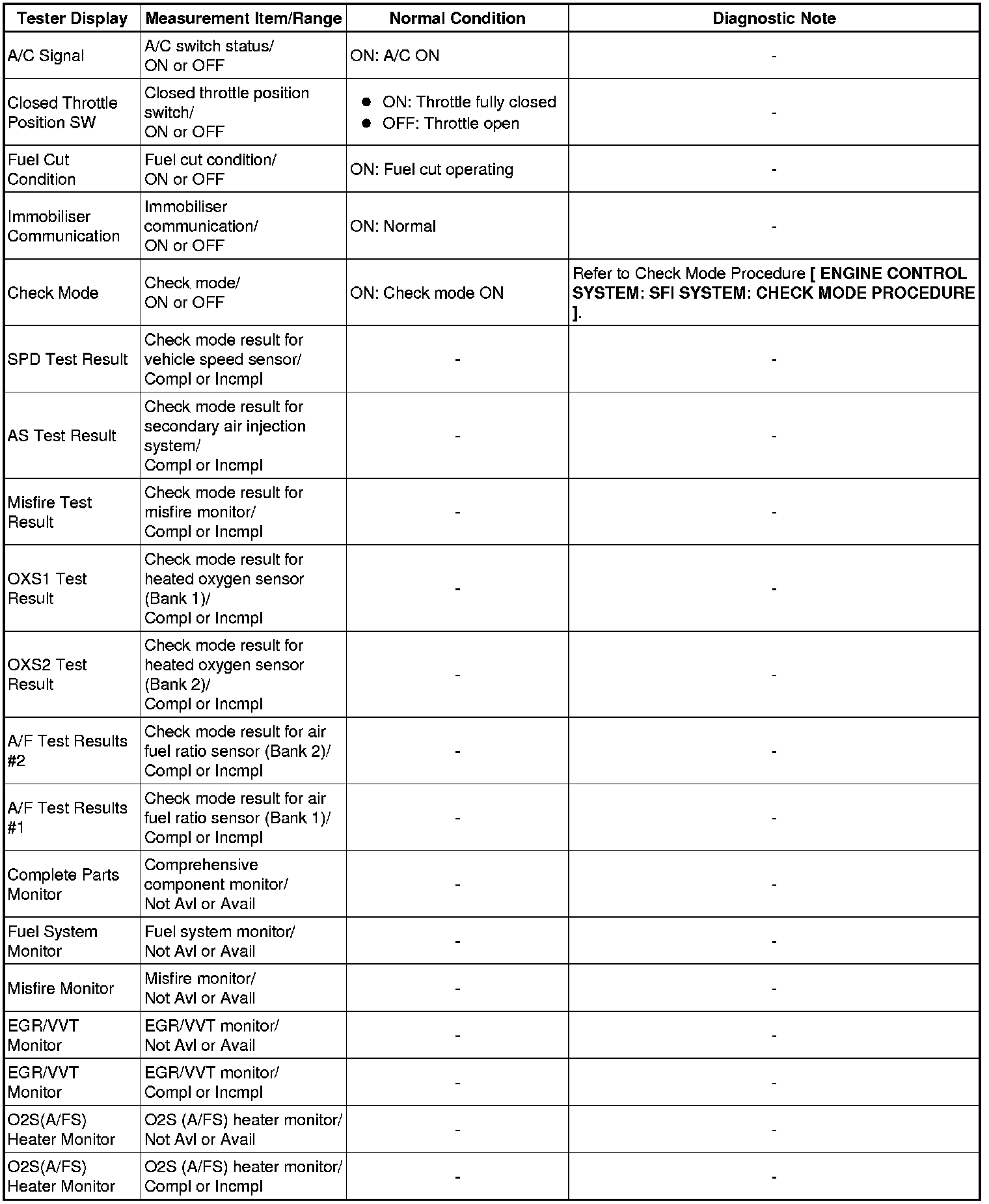 * Normal Condition: If no conditions are specifically stated for "idling", the shift lever is in N or P, the A/C switch is off, and all accessory switches are off.