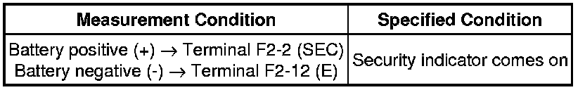(b) Apply battery voltage from the wire harness back side between the specified terminals of the indicator, and check the lighting condition of the security indicator.