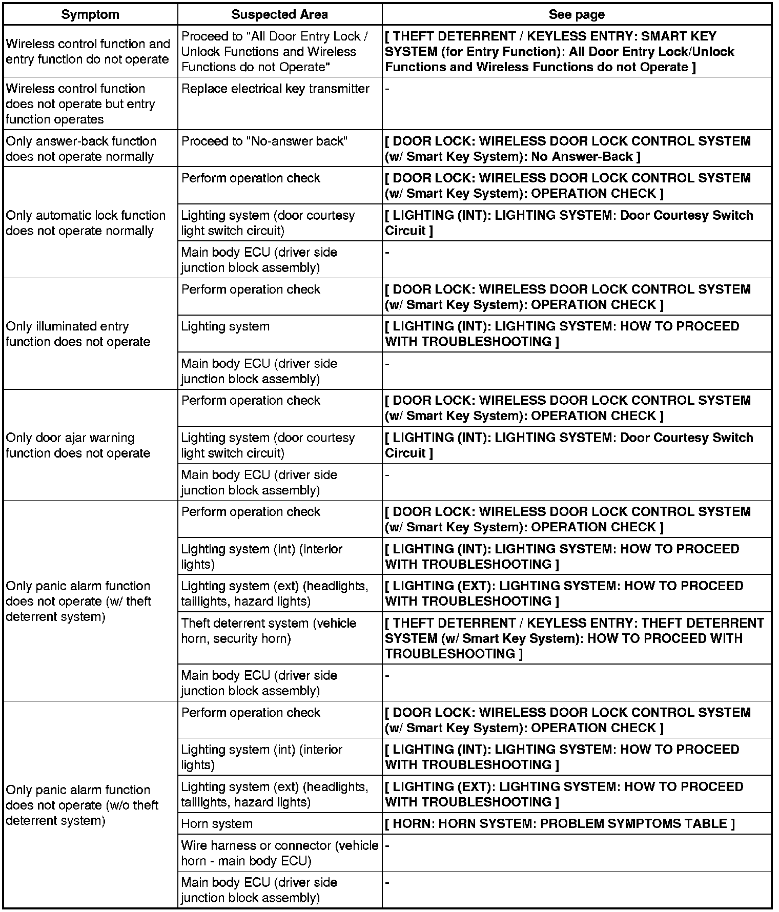 DOOR LOCK: WIRELESS DOOR LOCK CONTROL SYSTEM (w/ Smart Key System): PROBLEM SYMPTOMS TABLE