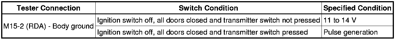 (a) Inspect the diagnostic outputs when the door control transmitter switch is held down. The diagnostic outputs can be checked by the flash patterns of the interior lights and the buzzer patterns of the wireless door lock buzzer.