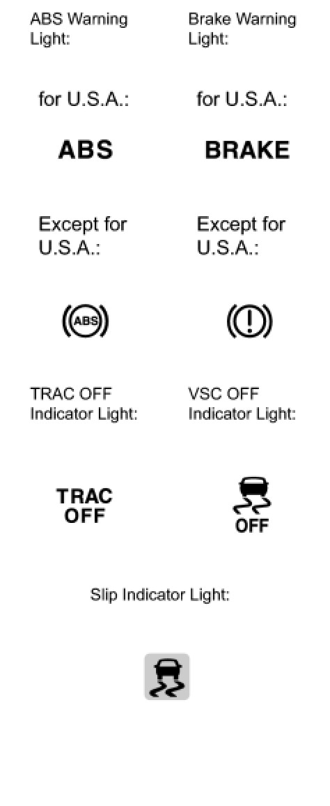 (b) When the ignition switch is turned to ON, check that the ABS warning, brake warning, TRAC OFF indicator, VSC OFF indicator and slip indicator lights all come on for approximately 3 seconds.