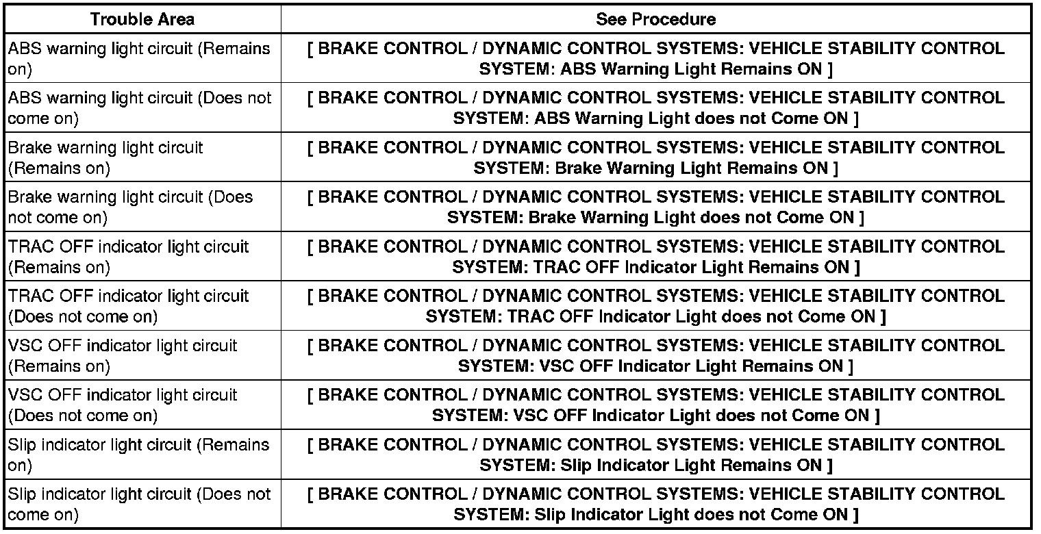 * If the skid control ECU stores any DTCs, the ABS warning and slip indicator lights will come on.