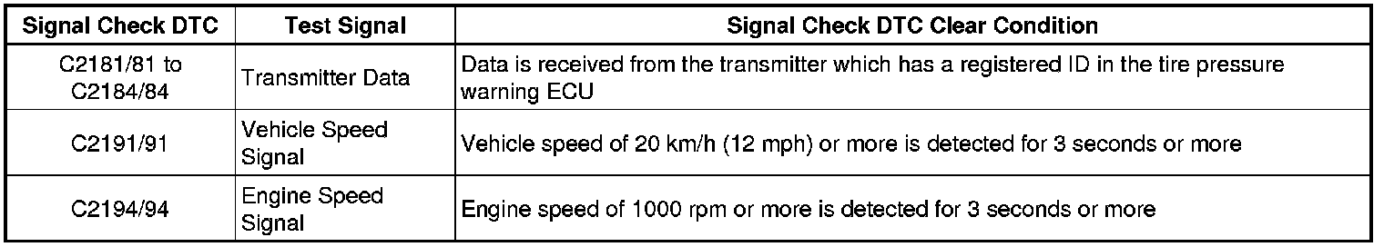 * After the tire pressure warning ECU completes the signal check for each inspection item, the DTCs for systems that are determined to be normal will be cleared.