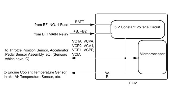 The ECM constantly generates 5 V of power from battery voltage supplied to the +B (BATT) terminal to operate the microprocessor. The ECM also provides this power to the sensors through the VC output circuit.
