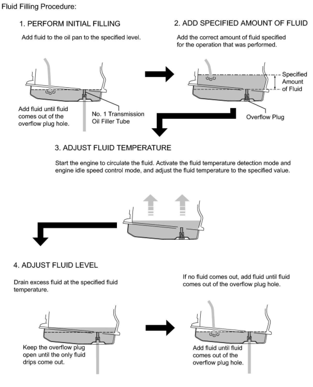 If only a small amount of fluid (approximately 1 cc) comes out of the overflow plug hole, then only fluid remaining in the No. 1 transmission oil filler tube has come out. This condition is not considered as overflow, so it is necessary to add fluid.