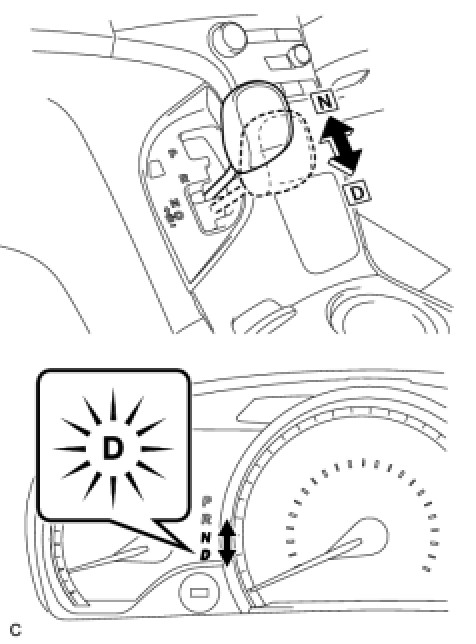 (5) While observing the D shift indicator on the combination meter, move the shift lever back and forth between N and D at an interval of 1.5 seconds for 6 seconds or more.
