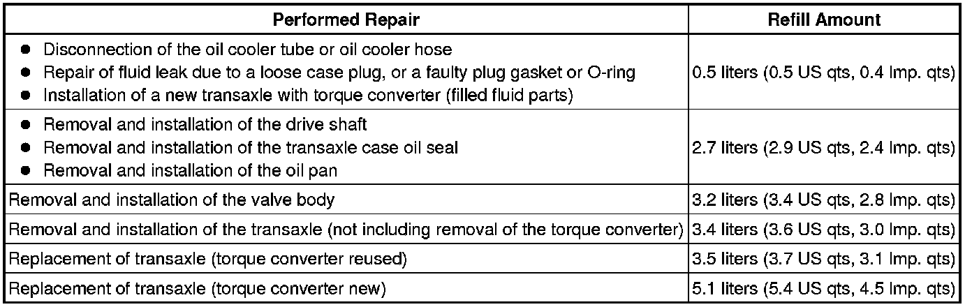 (a) Fill the transaxle with the correct amount of fluid as listed in the table below.