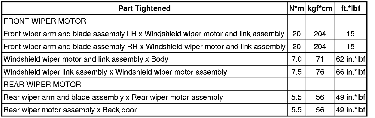 SPECIFICATIONS: WIPER / WASHER: TORQUE SPECIFICATIONS