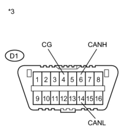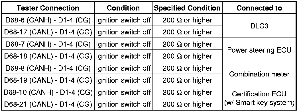 There may be a short circuit between the CAN bus main wire and GND when there is no resistance between terminals 6 (CANH) and 4 (CG) or 14 (CANL) and 4 (CG) of the DLC3.