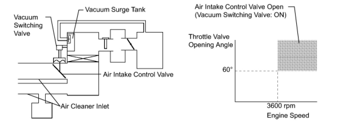 When the engine is operating in the low-to-mid speed range, this control operates the air intake control valve to close one of the air cleaner inlets. When the engine speed is more than 3600 rpm and the opening angle of the throttle valve is more than 60°, the ECM activates the vacuum switching valve and opens the air intake control valve.