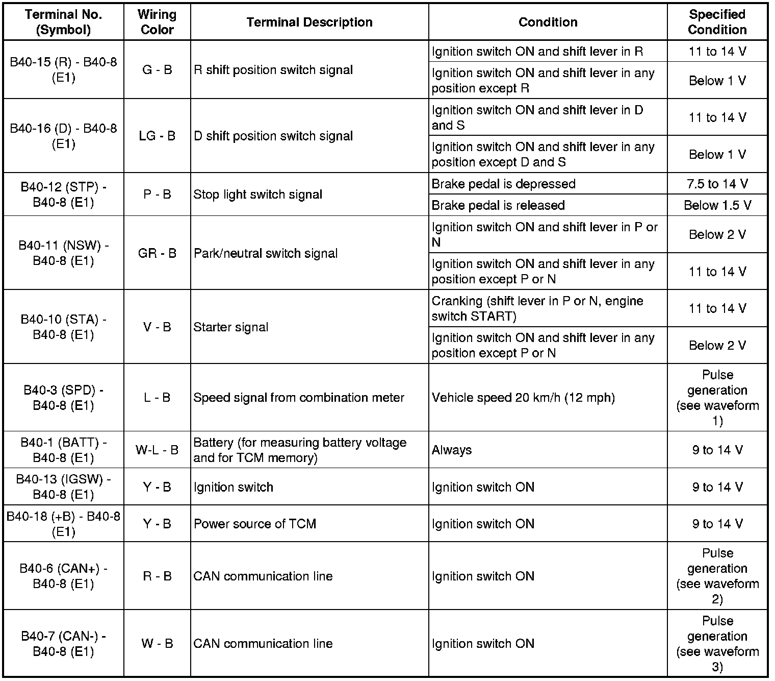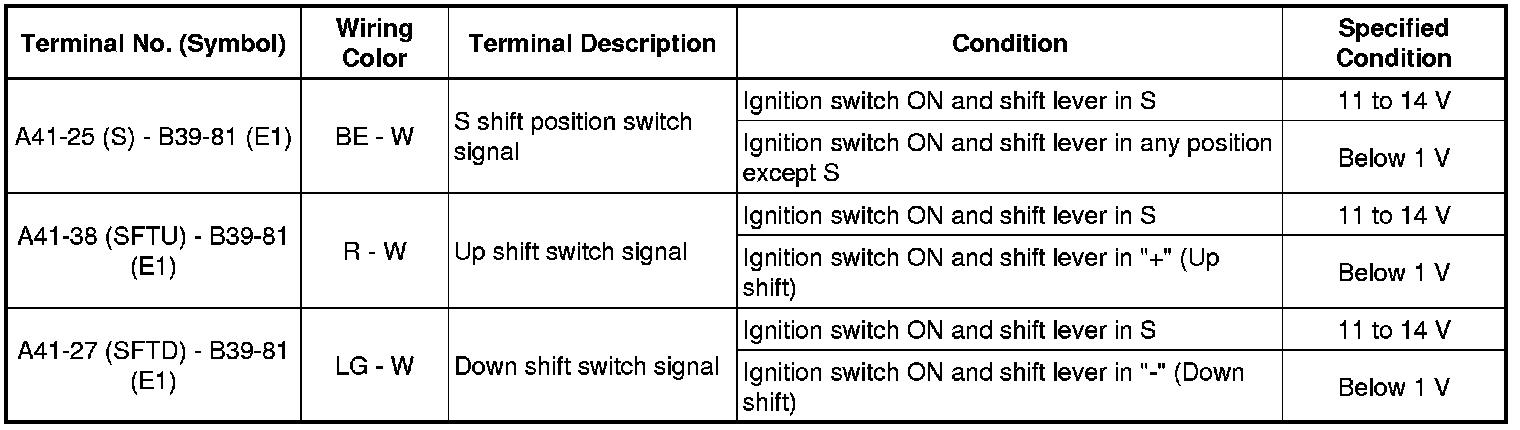In the table, first follow the information under "Condition". Look under "Terminal No. (Symbol)" for the terminals to be inspected. The standard voltage between the terminals is shown under "Specified Condition".
