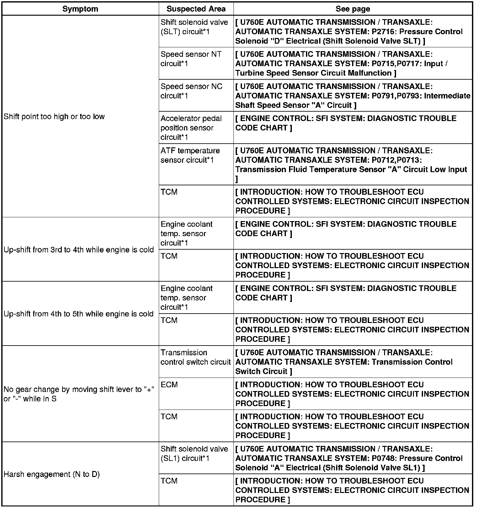 U760E AUTOMATIC TRANSMISSION / TRANSAXLE: AUTOMATIC TRANSAXLE SYSTEM: PROBLEM SYMPTOMS TABLE