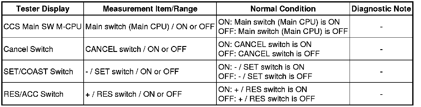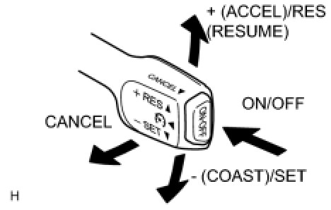 The cruise control main switch operates 7 functions: SET, - (COAST), TAP-DOWN, RES (RESUME), + (ACCEL), TAP-UP, and CANCEL. The SET, TAP-DOWN, and - (COAST) functions, and the RES (RESUME), TAP-UP, and + (ACCEL) functions are operated with the same switch. The cruise control main switch is an automatic return type switch which turns on only while operated in the directions of the arrows and turns off when it is released. The internal contact point of the cruise control main switch is turned on with the switch operation. Then the ECM reads the voltage value that has been changed by the switch operation to control SET, - (COAST), RES (RESUME), + (ACCEL), and CANCEL.