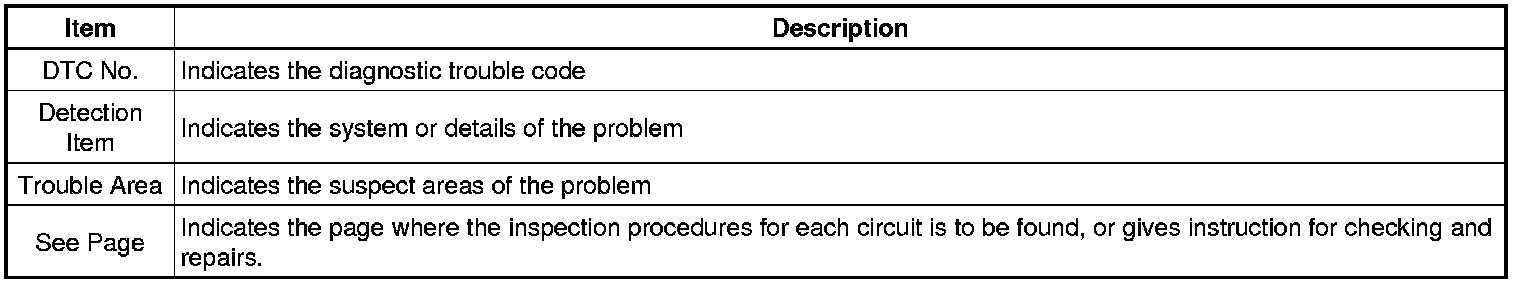 Look for output Diagnostic Trouble Codes (DTCs) (from the DTC checks) in the appropriate section's Diagnostic Trouble Code Chart. Use the chart to determine the trouble area and the proper inspection procedure. A description of each of the chart's columns are below.