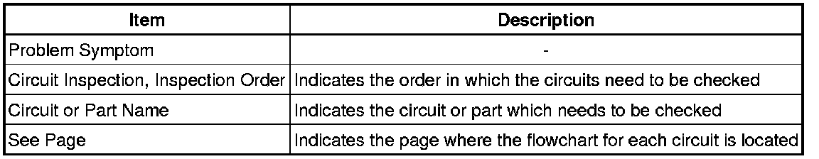 When a "Normal" code is output during a DTC check but the problem is still occurring, use the Problem Symptoms Table. The suspected areas (circuits or parts) for each problem symptoms are in the table. The suspected areas are listed in order of probability. A description of each of the chart's columns are below.