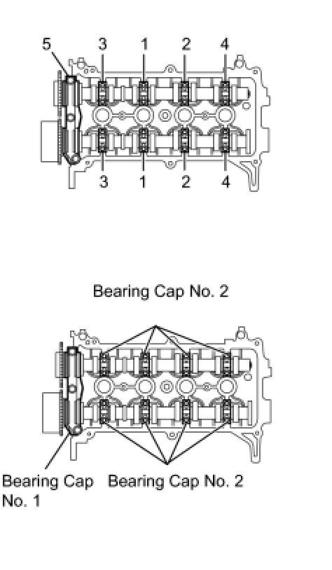 Uniformly tighten the bolts in several steps in the sequence shown in the illustration and install camshaft bearing cap No. 1 and camshaft bearing cap No. 2.