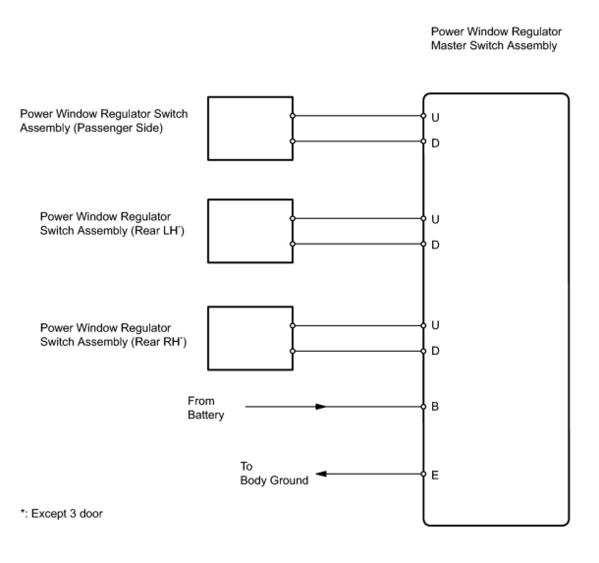 With the ignition switch ON, the power window regulator master switch transmits remote switch signals to the regulator switches of the passenger door power window and rear door power windows. Then, each regulator switch drives its respective power window regulator motor.