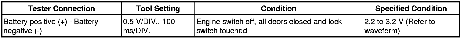 When measuring the battery voltage, bring the electrical key transmitter within the smart key system operating range and operate the lock switch of a door handle to perform the measurement. For the smart key system operating range, refer to System Description System Description.