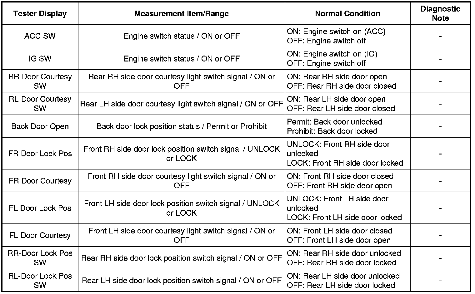 Using the Techstream to read the Data List allows the values or states of switches, sensors, actuators and other items to be read without removing any parts. This non-intrusive inspection can be very useful because intermittent conditions or signals may be discovered before parts or wiring is disturbed. Reading the Data List information early in troubleshooting is one way to save diagnostic time.