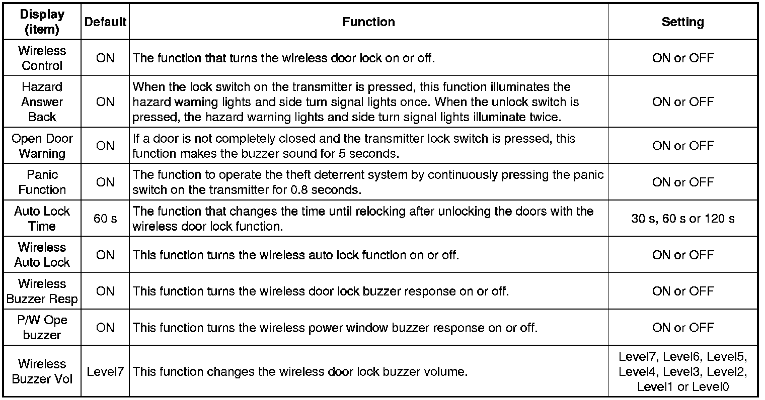 DOOR LOCK: WIRELESS DOOR LOCK CONTROL SYSTEM (w/o Smart Key System): CUSTOMIZE PARAMETERS