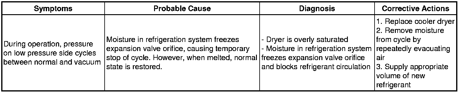 (2) The A/C system periodically changes between normal and improper function due to moisture in the refrigerant system.