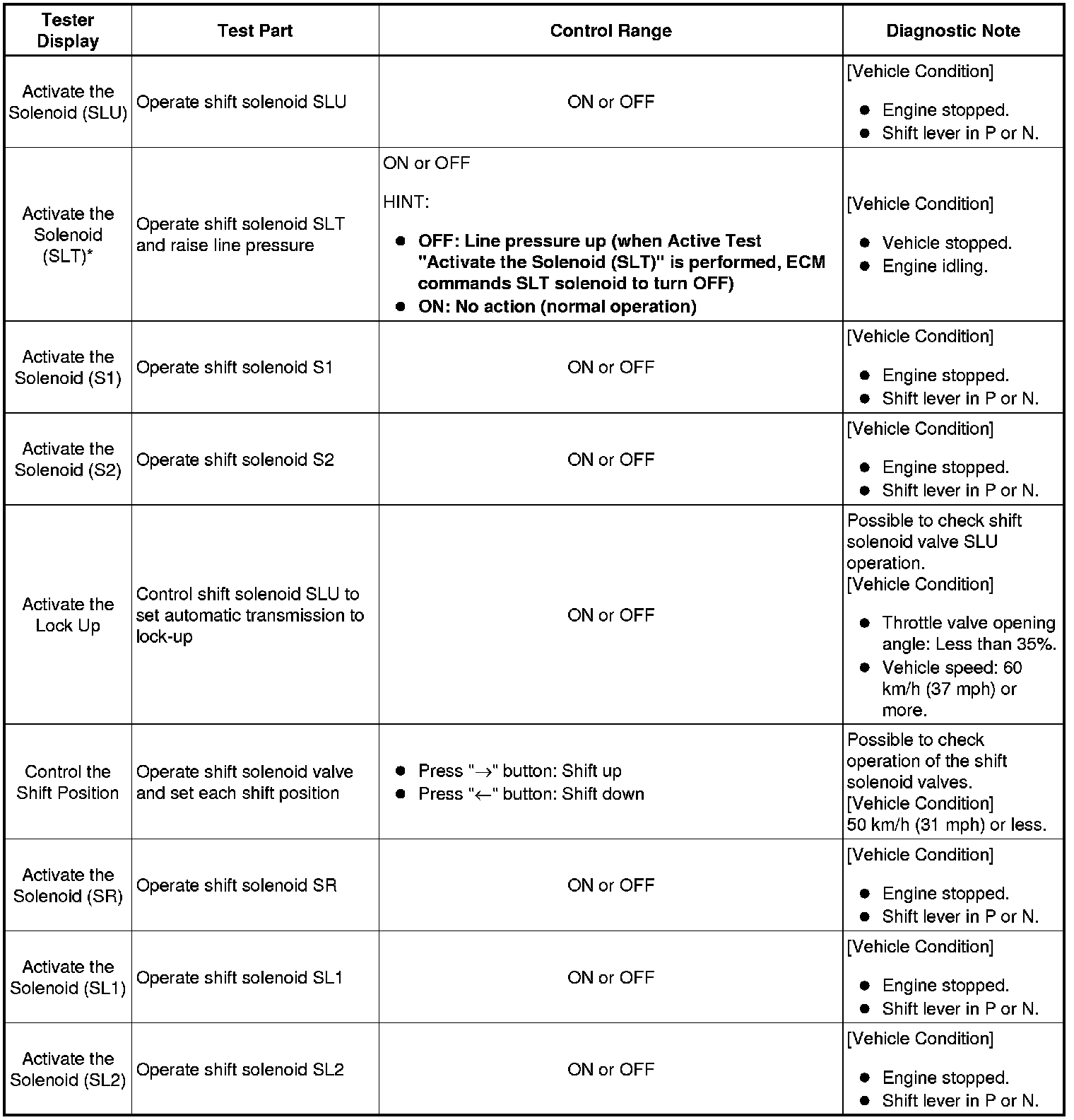 *: Activate the Solenoid (SLT) in the Active Test is performed to check the line pressure changes by connecting SST to the automatic transmission, which is used in the Hydraulic Test Hydraulic Test as well. Note that the pressure values in the Active Test and Hydraulic Test are different.