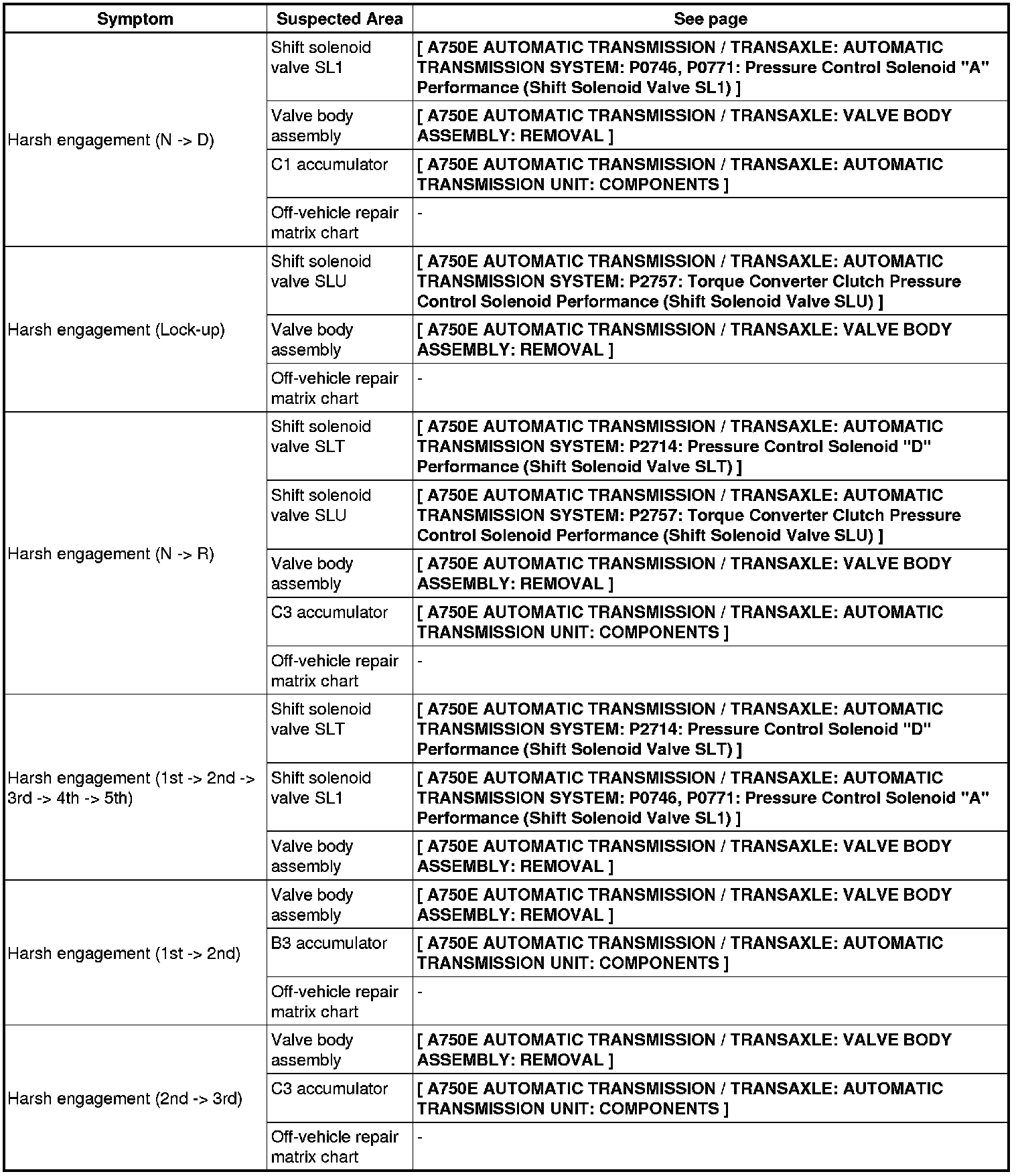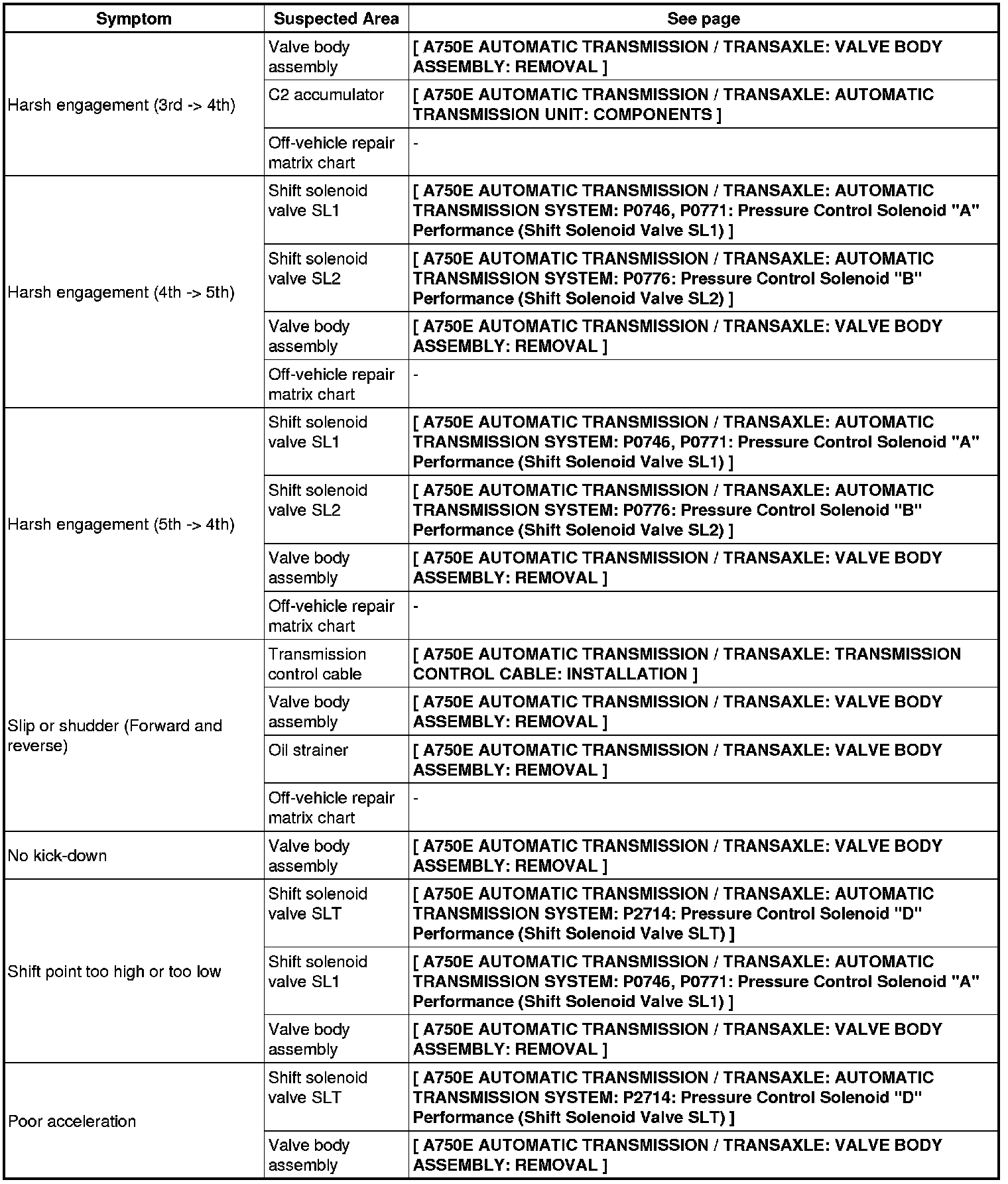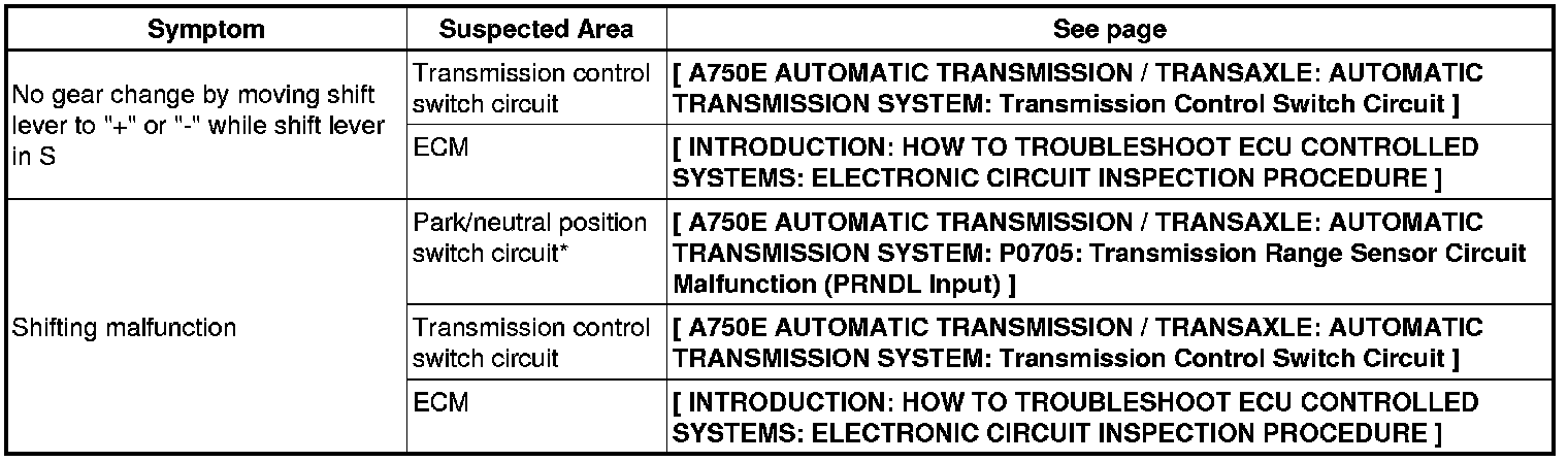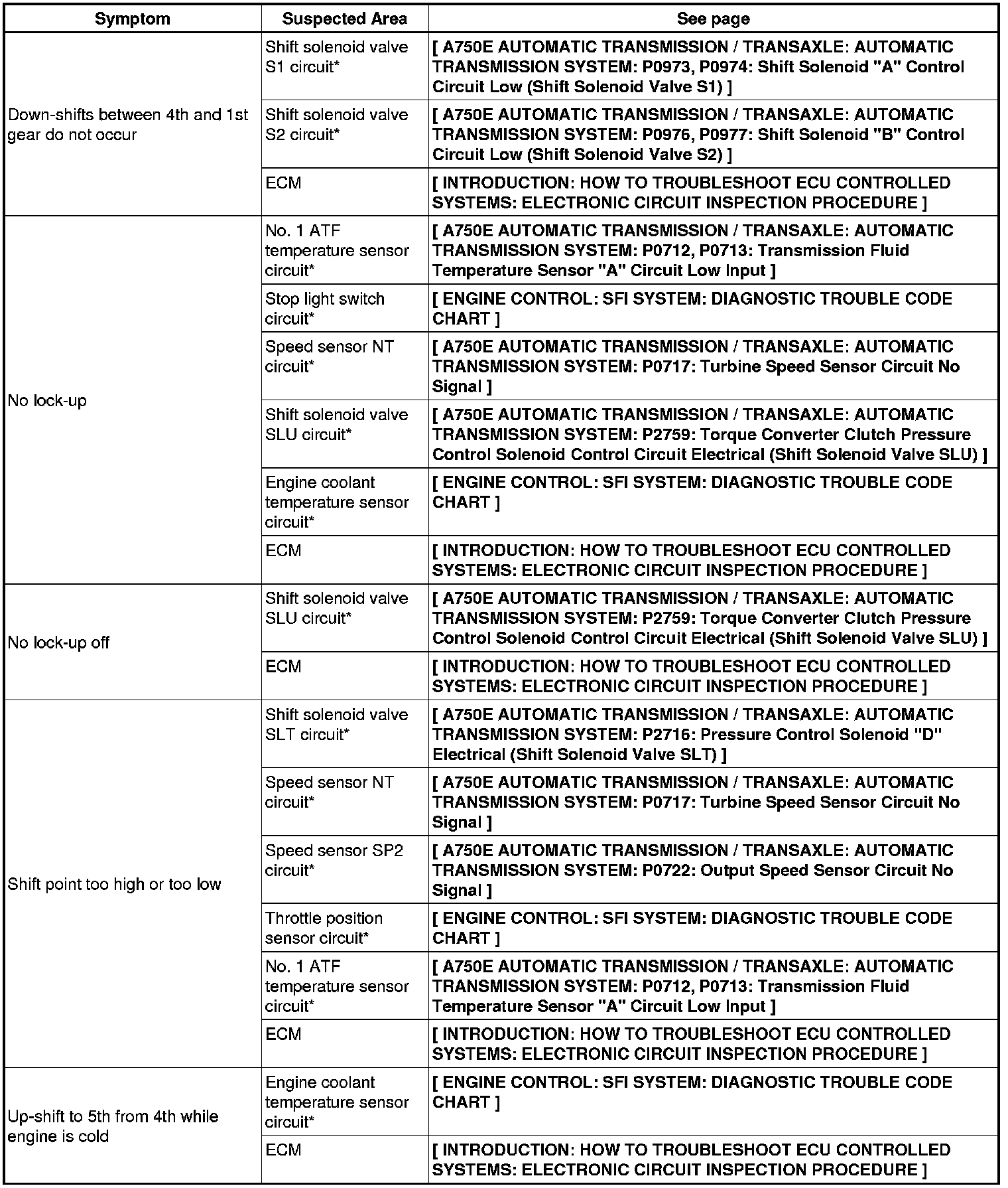 A750E AUTOMATIC TRANSMISSION / TRANSAXLE: AUTOMATIC TRANSMISSION SYSTEM: PROBLEM SYMPTOMS TABLE