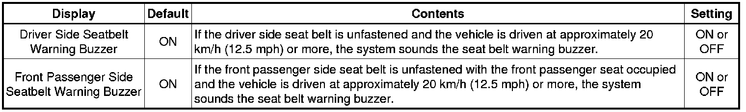 SEAT BELT: SEAT BELT WARNING SYSTEM: CUSTOMIZE PARAMETERS