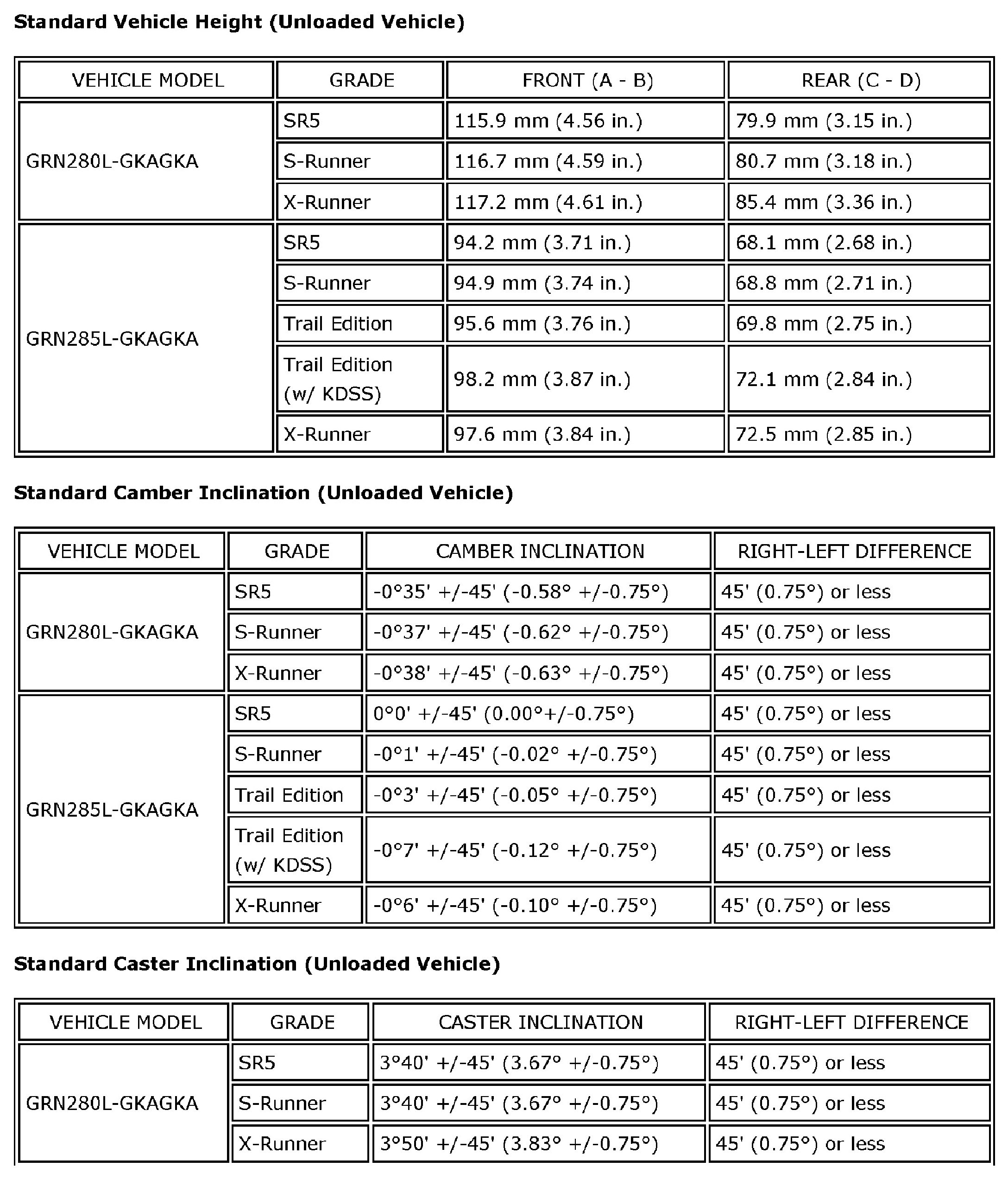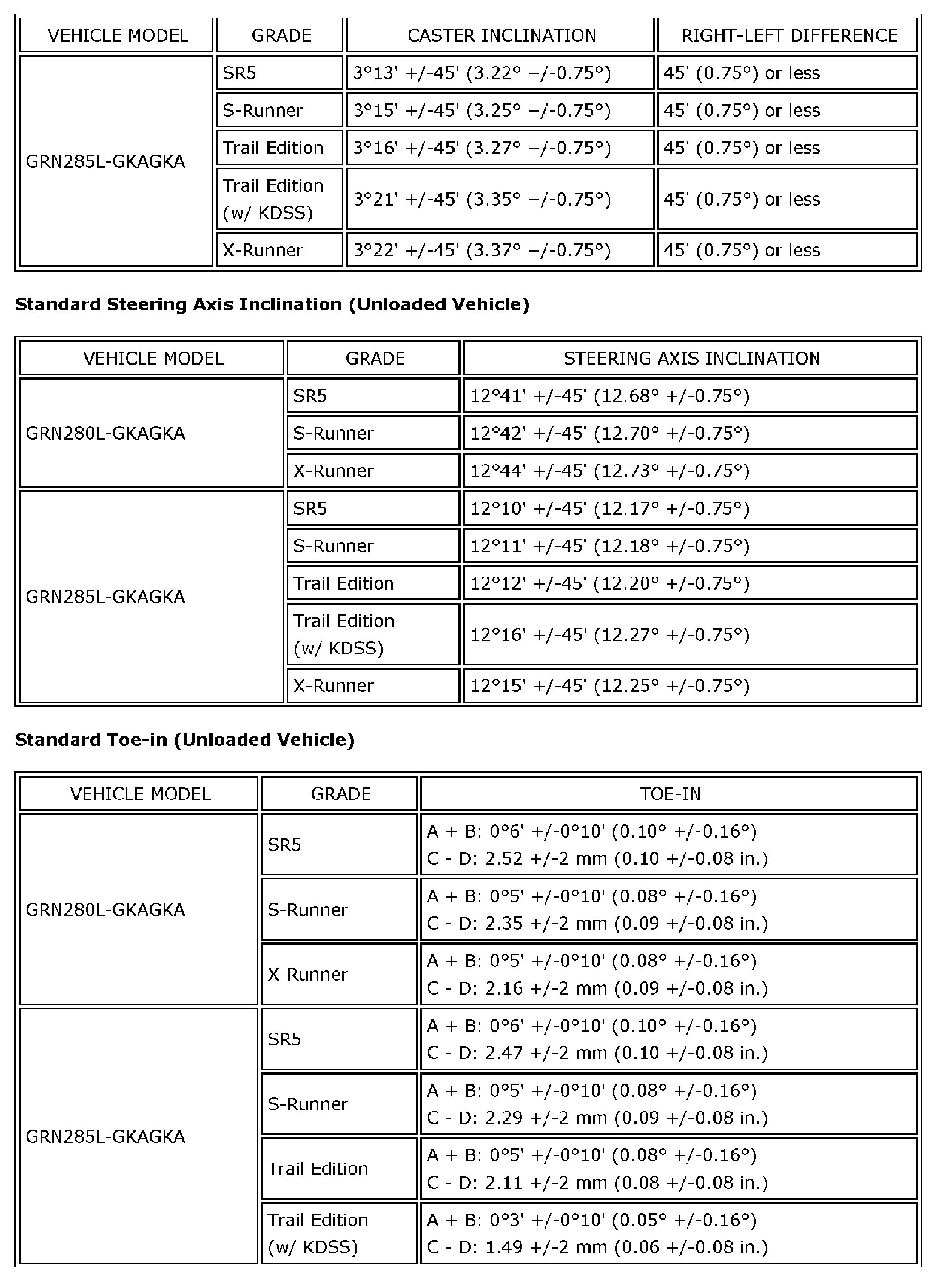 SPECIFICATIONS: ALIGNMENT / HANDLING DIAGNOSIS: SERVICE DATA