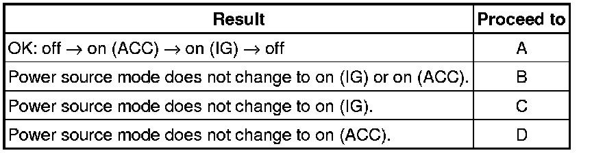D -- GO TO POWER SOURCE MODE DOES NOT CHANGE TO ON (ACC) Power Source Mode does not Change to ON (ACC)