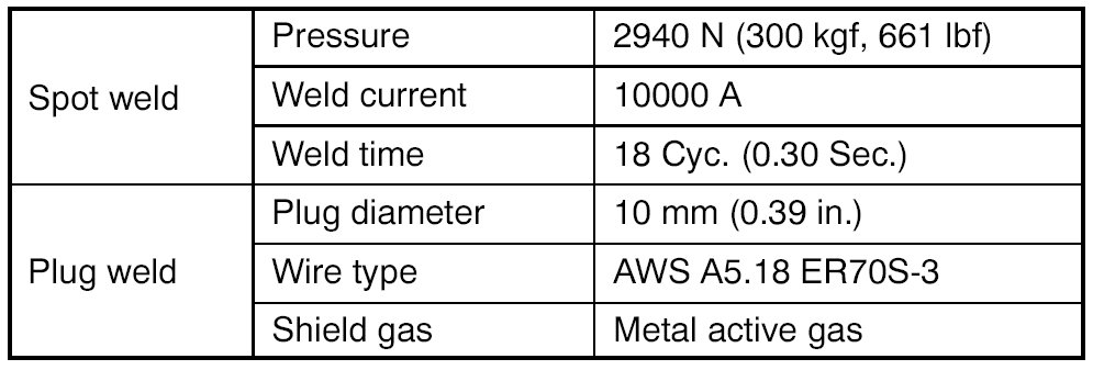 1. Follow the welding conditions below when welding ultra high strength steel to assure sufficient weld strength.