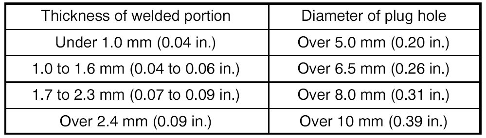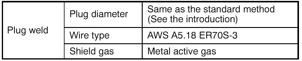 NOTICE: Be sure to use Metal active gas (Ar 80% + CO2 20%) as the shield gas when plug welding. Sufficient weld strength cannot be assured when using 100% CO2 shield gas.