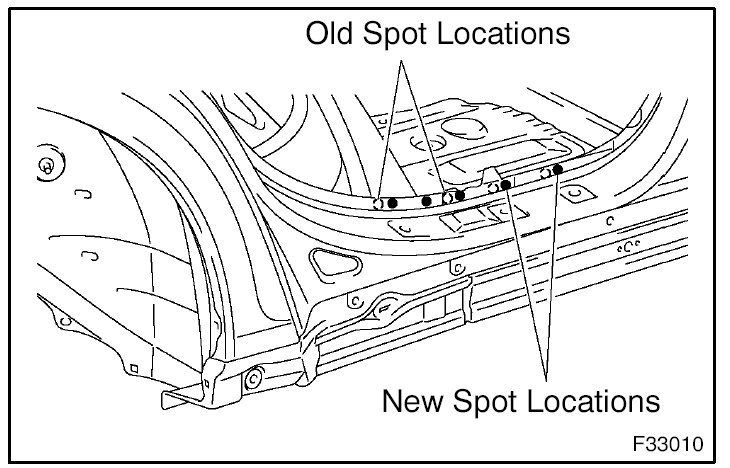 NOTICE: Inspect the welds after spot welding. For points with insufficient weld strength join the panels using plug welds.