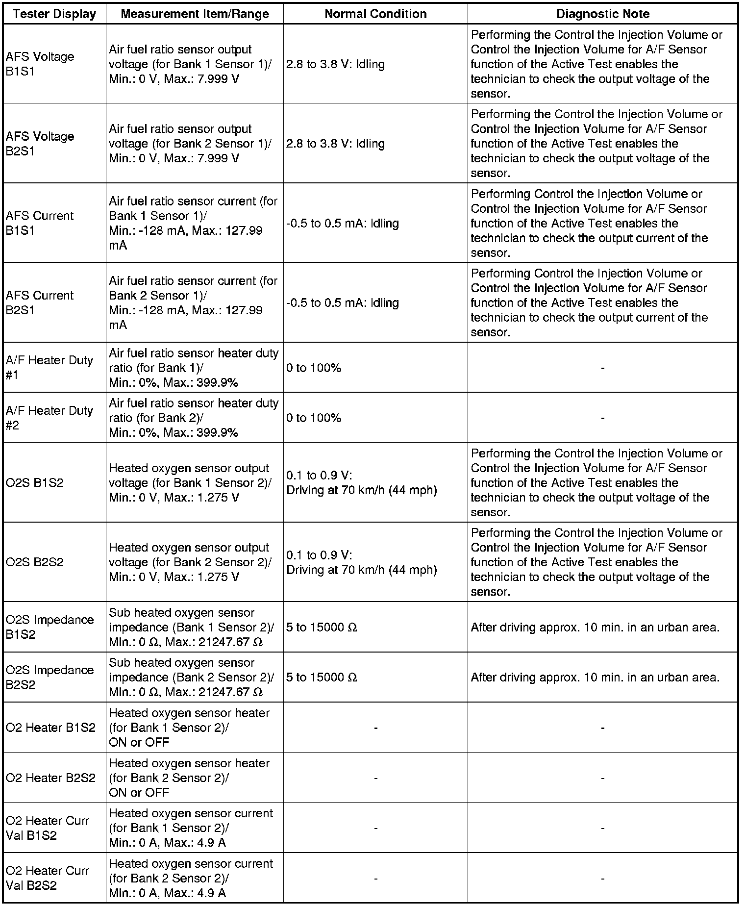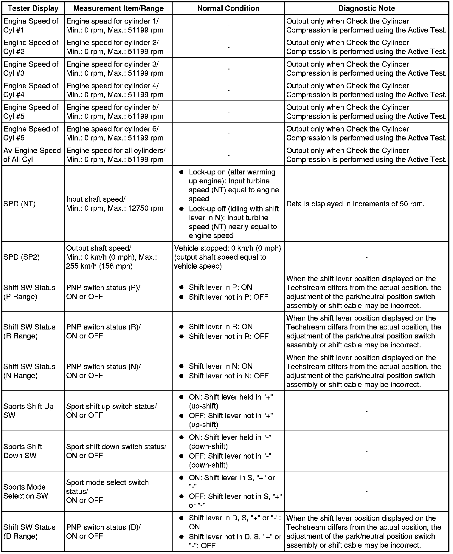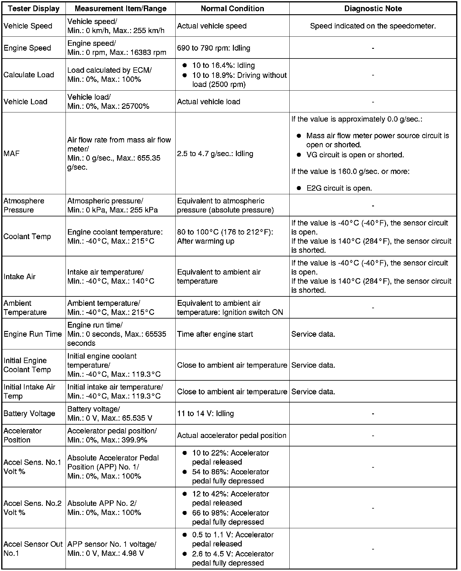 Using the Techstream to read the Data List allows the values or states of switches, sensors, actuators and other items to be read without removing any parts. This non-intrusive inspection can be very useful because intermittent conditions or signals may be discovered before parts or wiring is disturbed. Reading the Data List information early in troubleshooting is one way to save diagnostic time.
