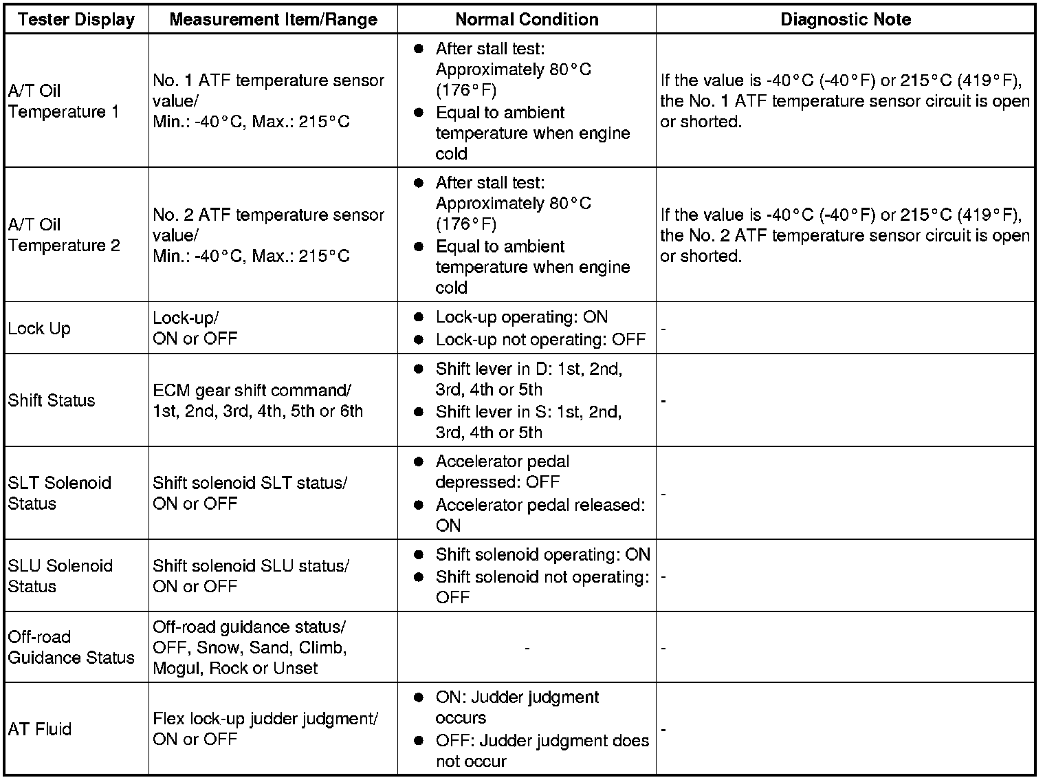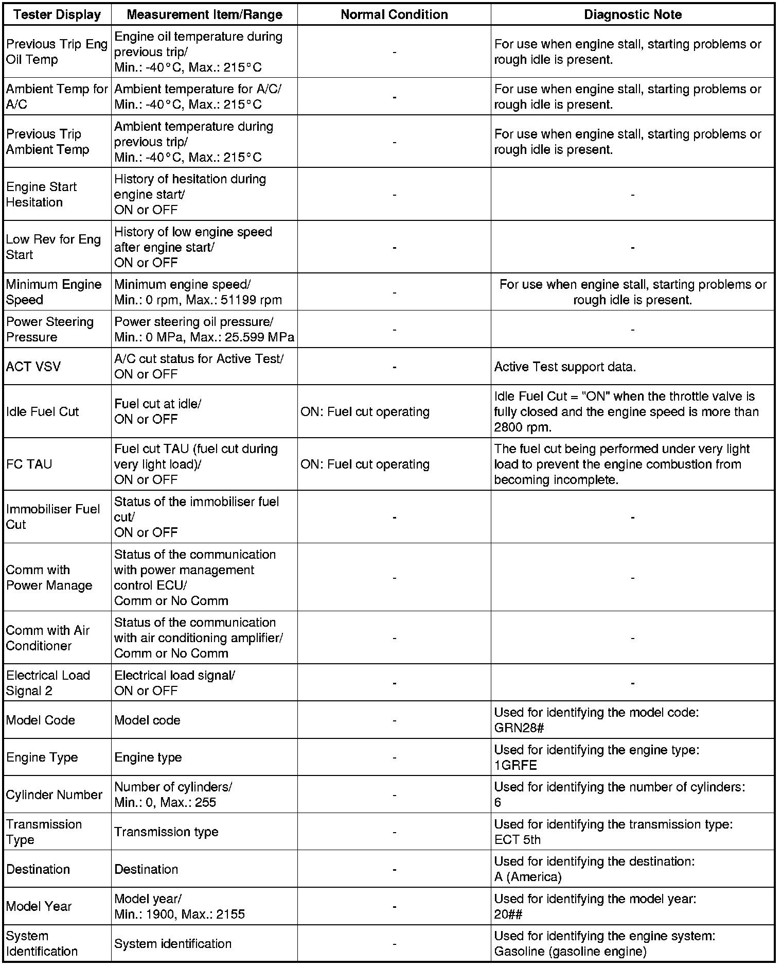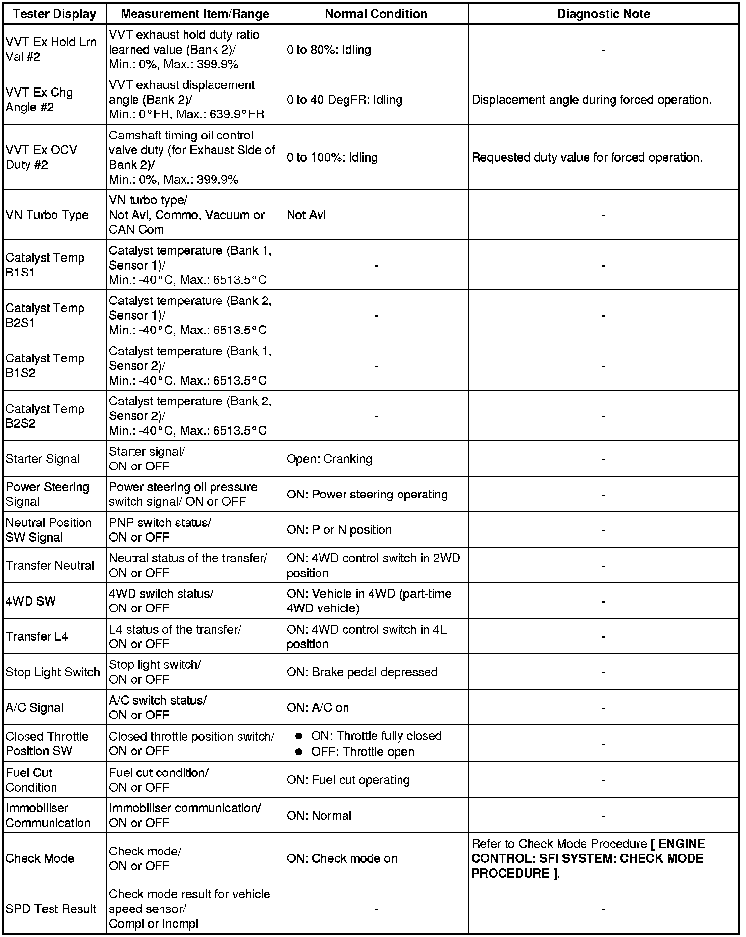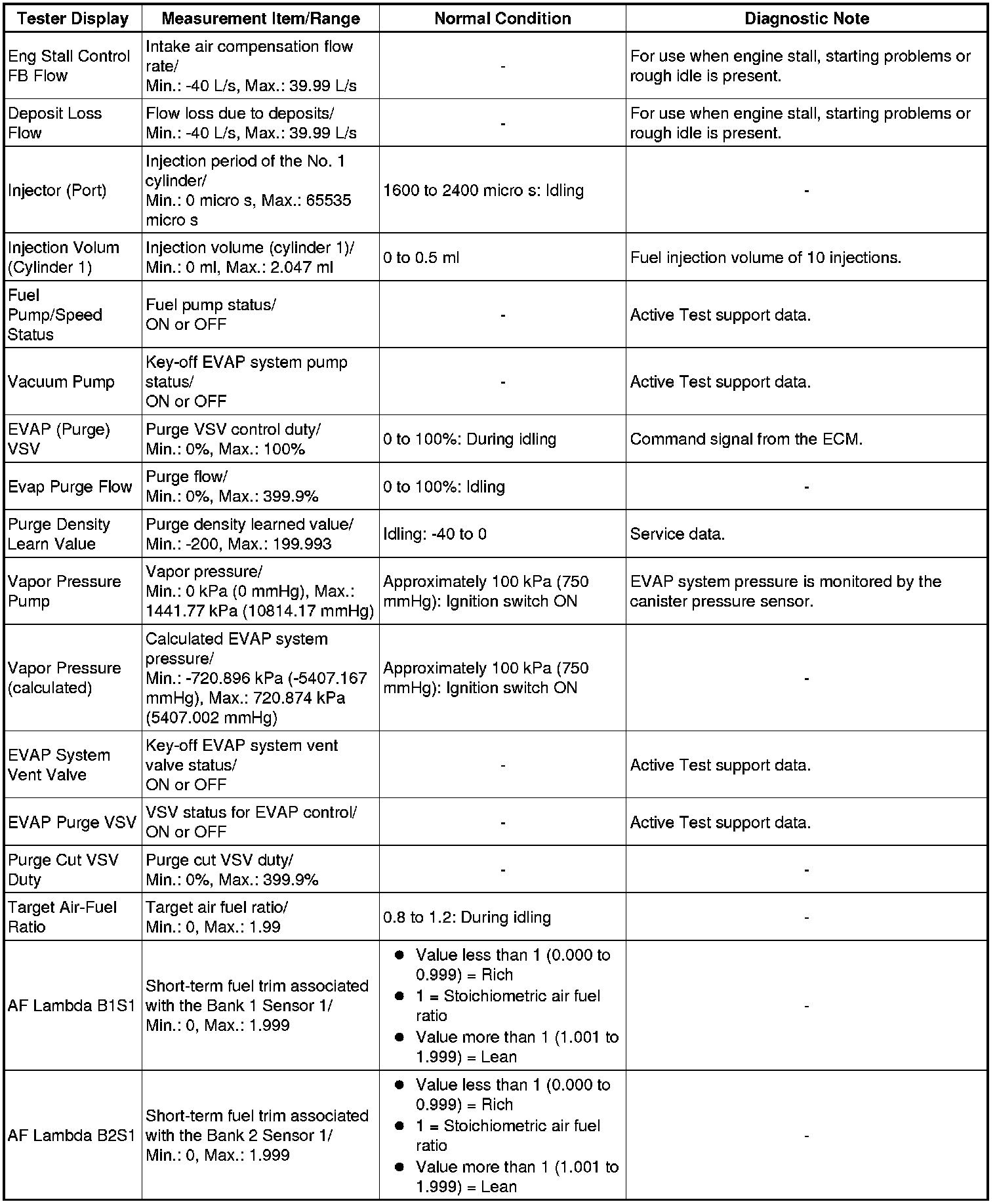 Using the Techstream to read the Data List allows the values or states of switches, sensors, actuators and other items to be read without removing any parts. This non-intrusive inspection can be very useful because intermittent conditions or signals may be discovered before parts or wiring is disturbed. Reading the Data List information early in troubleshooting is one way to save diagnostic time.