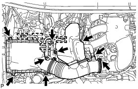 (1) Disconnect the mass air flow meter connector, vacuum hose and ventilation hose and detach the 4 clamps.