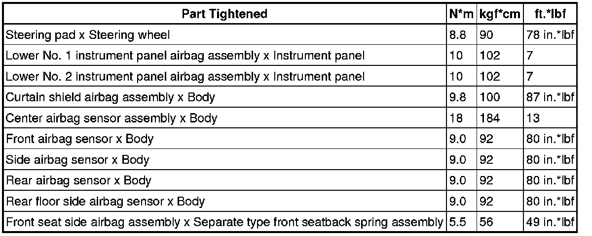 SPECIFICATIONS: SUPPLEMENTAL RESTRAINT SYSTEMS: TORQUE SPECIFICATIONS
