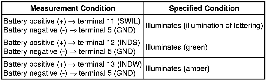 (b) Apply battery voltage to the terminals of the switch and check the illumination condition of the switch.