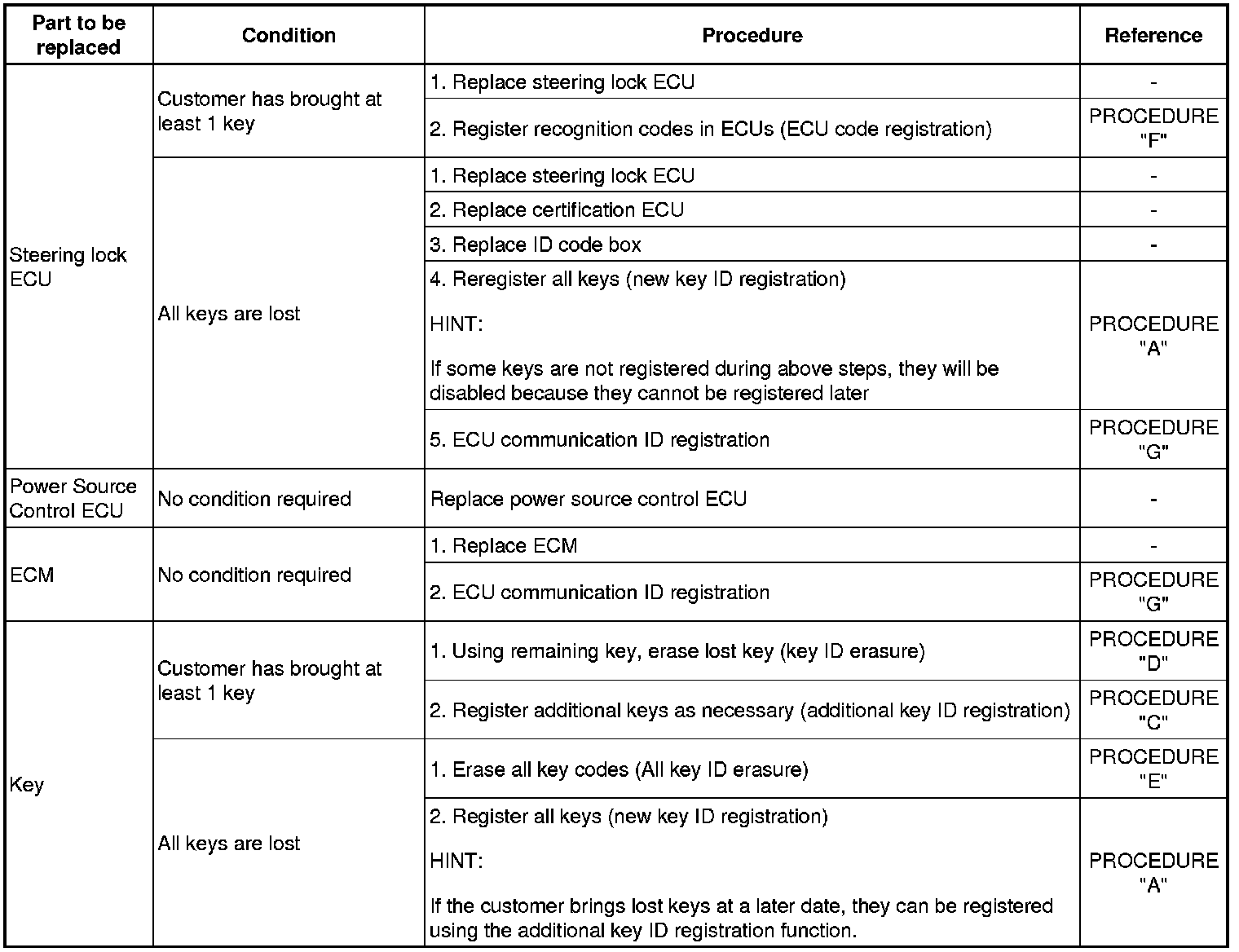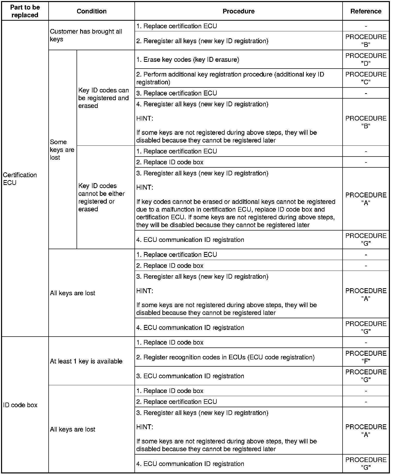 (a) The following table shows ECU replacement and key registration procedures in case the malfunctioning ECU has been specified after troubleshooting the smart key system.