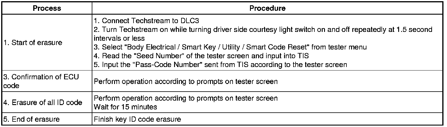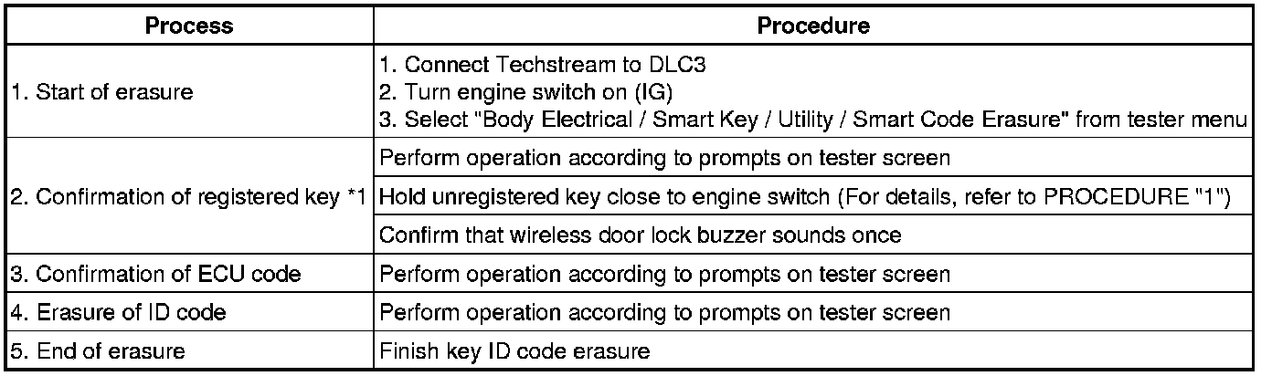 *1: Perform this process for one of the keys registered for the vehicle. Finish the procedure within 30 seconds. If the procedure has not been finished within the specified time, perform erasure procedures from process 1 again.