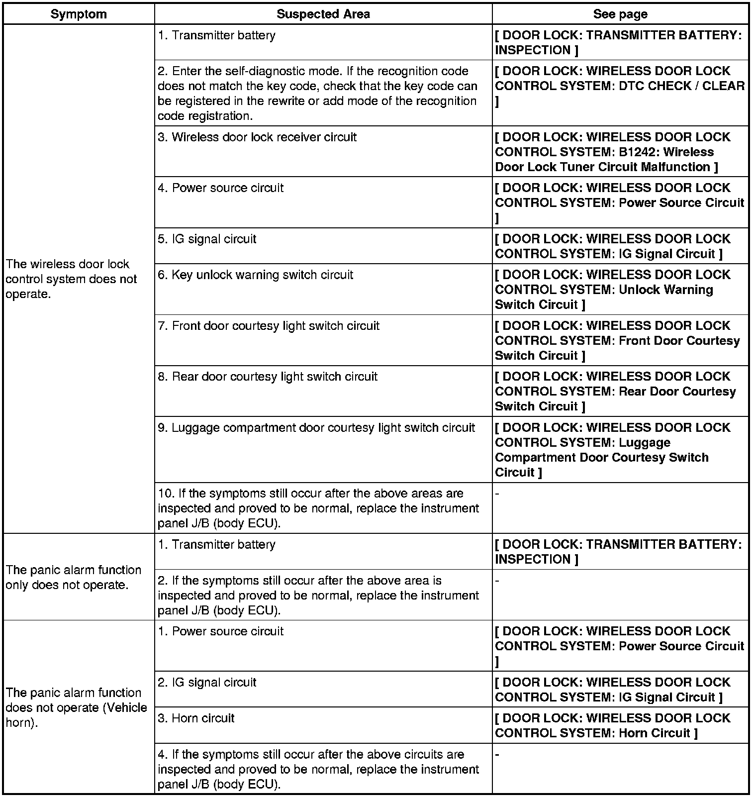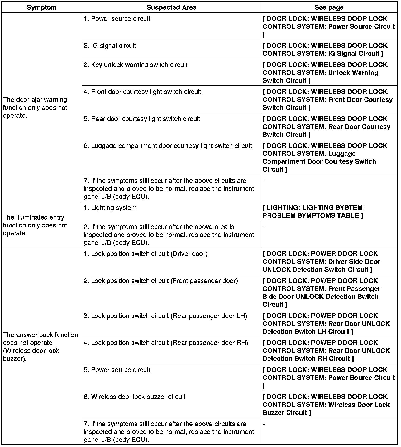 DOOR LOCK: WIRELESS DOOR LOCK CONTROL SYSTEM: PROBLEM SYMPTOMS TABLE