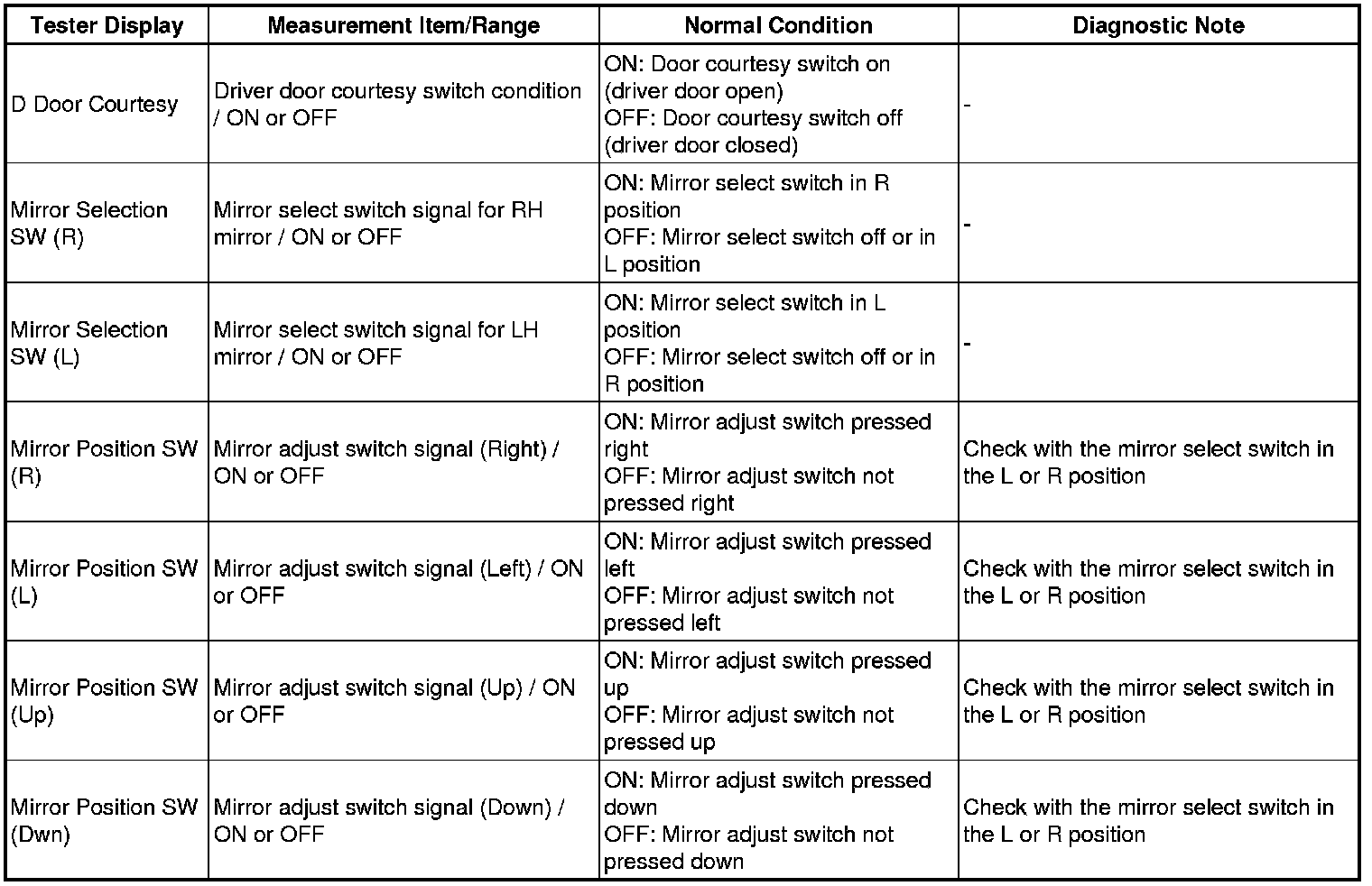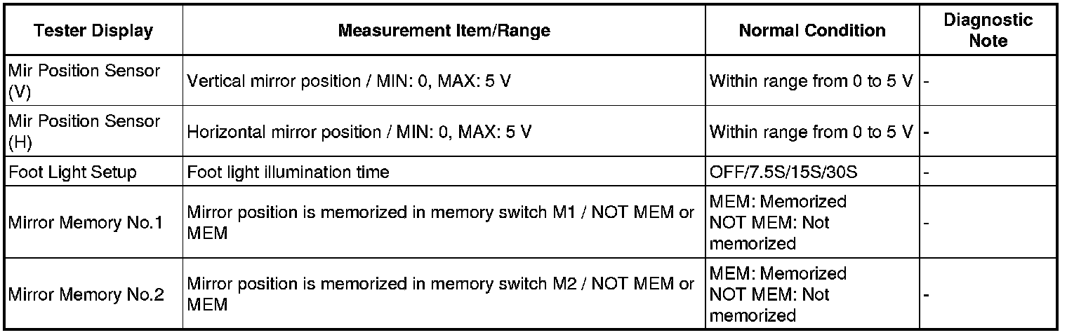 MIRROR: POWER MIRROR CONTROL SYSTEM (w/ Memory): DATA LIST / ACTIVE TEST
