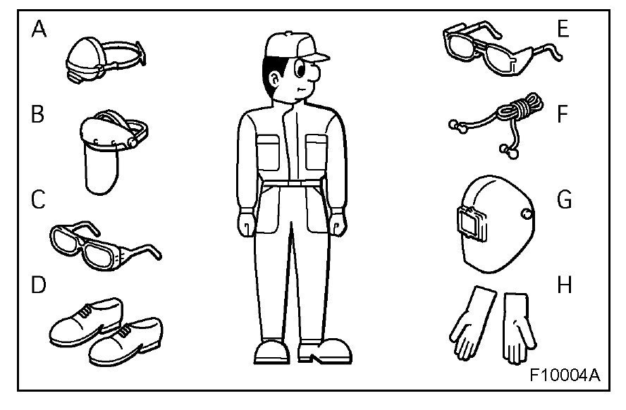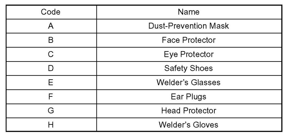 1. In addition to the usual mechanic's wear, cap and safety shoes, the appropriate gloves, head protector, glasses, ear plugs, face protector, dust-prevention mask, etc. should be worn as the situation demands.