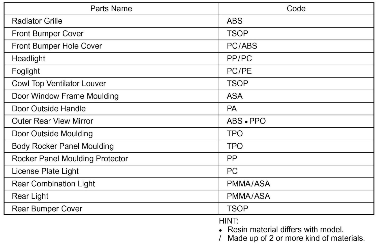 2. Plastic body parts are identified by the codes in the table.